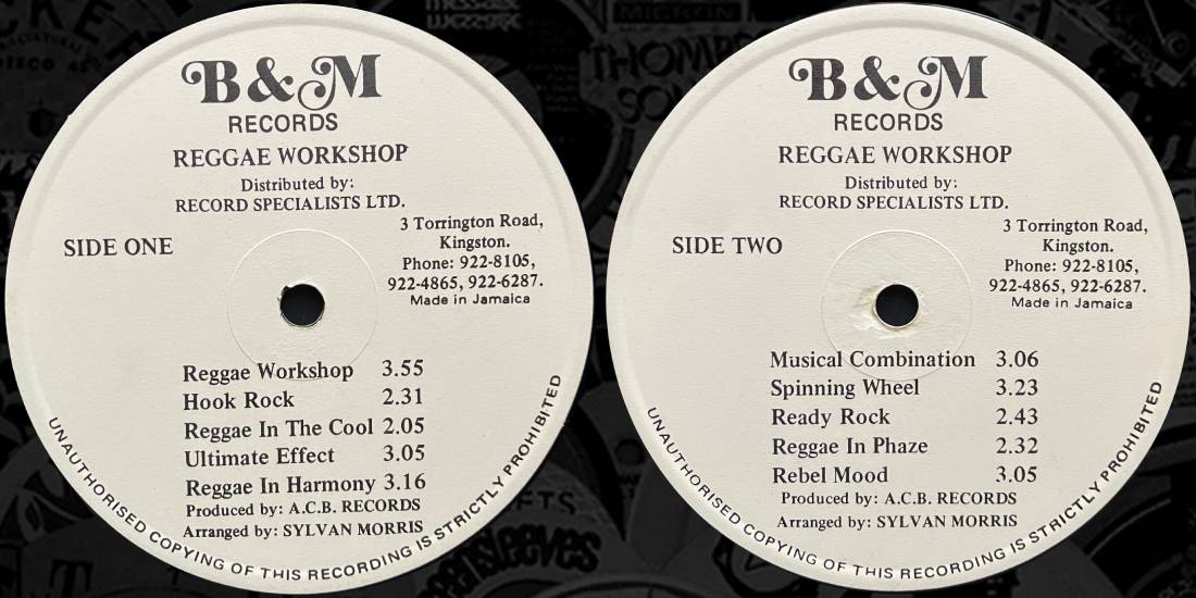 Sylvan Morris – Reggae Workshop – B & M Records (MMLP 001) UK 1975 cov : NC / rec : EX Produced by ABC Records rare dub/instru album mixed by legendary engineer Sylvan Morris, UK issue in great condition, sometimes issued in a plain white sleeve (like here) or in an alternative yellow sleeve, which differs from the JA print and its brown sleeve starting price : 25 euros