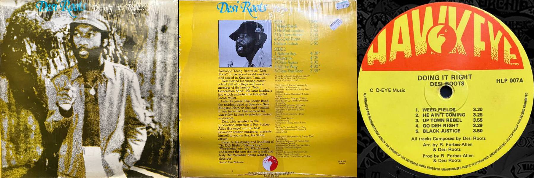 Desi Roots – Doing It Right – Hawkeye (HLP 007) UK 1980 cov : EX- / rec : EX Produced by R.Forbes Allen & Desi Roots the first album by Desi Roots aka Desmond Young, great album with original compositions and arrangements, backed by a large line up of top musicans, and the harmonies of Sugar Minott, Pam Hall & Beres Hammond ! Bid History : (6 bids) winning bid : 60,5 euros bid 2 : 55 euros bid 3 : 51 euros bids 4 & 5 : 30 euros bid 6 : 25 euros |