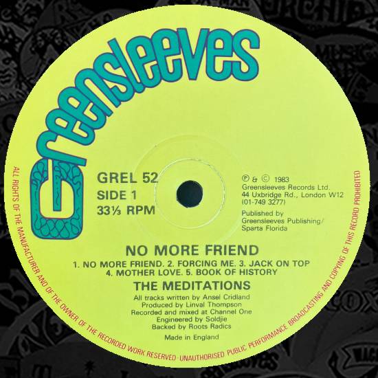Meditations – No More Friend – Greensleeves (GREL 52) UK 1983 cov : EX / rec : EX price : 15 euros Produced by Linval Thomspon Original UK issue, backed by Roots Radics |