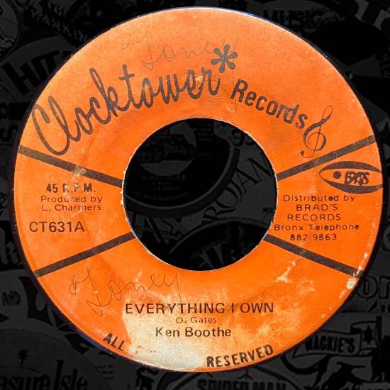 Ken Boothe – Everything I Own / Version Clocktower (CT631) USA 1975 VG / VG.VG+ price : 3 euros Produced by Lloyd Charmers classic, B side is piano version by Charmers, plays better than the vocal |